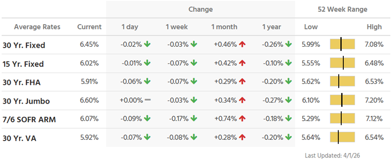 Interest rate and annual percentage rate (APR) are based on current market conditions as of 04/02/2026, are for informational purposes only, are subject to change without notice and may be subject to pricing add-ons related to property type, loan amount, loan-to-value, credit score and other variables. Estimated closing costs used in the APR calculation are assumed to be paid by the borrower at closing. If the closing costs are financed, the loan, APR and payment amounts will be higher. Contact us for details. Additional loan programs may be available. Accuracy is not guaranteed, and all products may not be available in all borrower's geographical areas and are based on their individual situation. This is not a credit decision or a commitment to lend. actual interest rate, APR, and payment may vary based on the specific terms of the loan selected, verification of information, your credit history, the location and type of property, and other factors as determined by Prosperity Home Mortgage, LLC. Not available in all states. Rate is as of 04/02/2026 and is subject to change at any time without notice. Opinions, estimates, forecasts, and other views contained in this document are those of Freddie Mac’s economists and other researchers, do not necessarily represent the views of Freddie Mac or its management, and should not be construed as indicating Freddie Mac’s business prospects or expected results. Although the authors attempt to provide reliable, useful information, they do not guarantee that the information or other content in this document is accurate, current, or suitable for any particular purpose. All content is subject to change without notice. All content is provided on an “as is” basis, with no warranties of any kind whatsoever. Information from this document may be used with proper attribution.