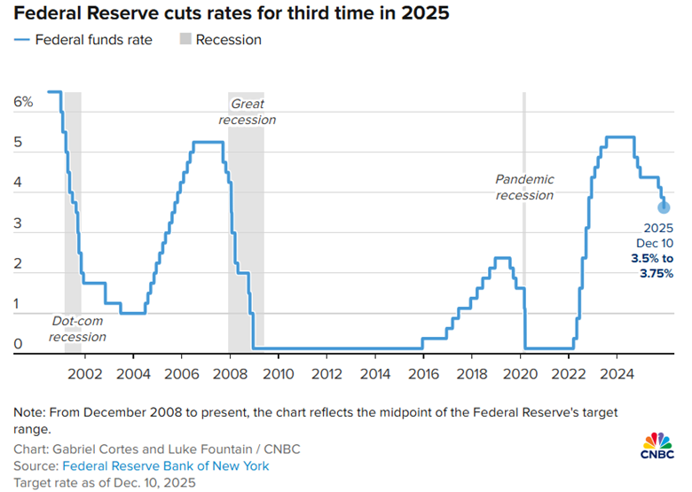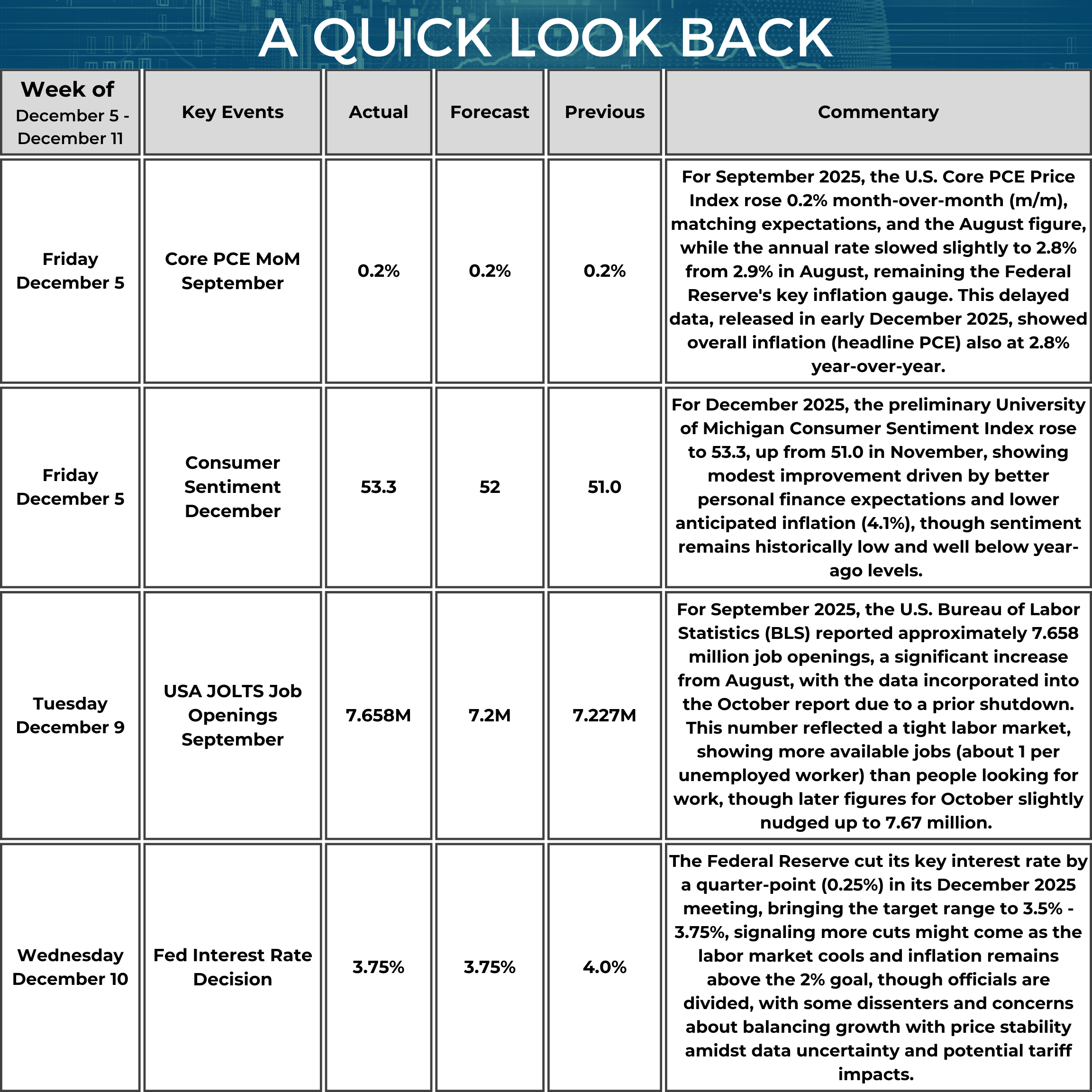 From December 5th to December 11th, interest rates remained flat. The Federal Reserve cut interest rates by 25 basis points at the conclusion of its two-day meeting on Wednesday, marking the central bank's third cut of the year. Fed officials were split on the decision to lower rates to a range of 3.50%-3.75%, with policymakers dissenting on both sides. This brings borrowing costs to their lowest level since 2022. The reasoning was labor market slowdown, inflation pressures, and government data delays.